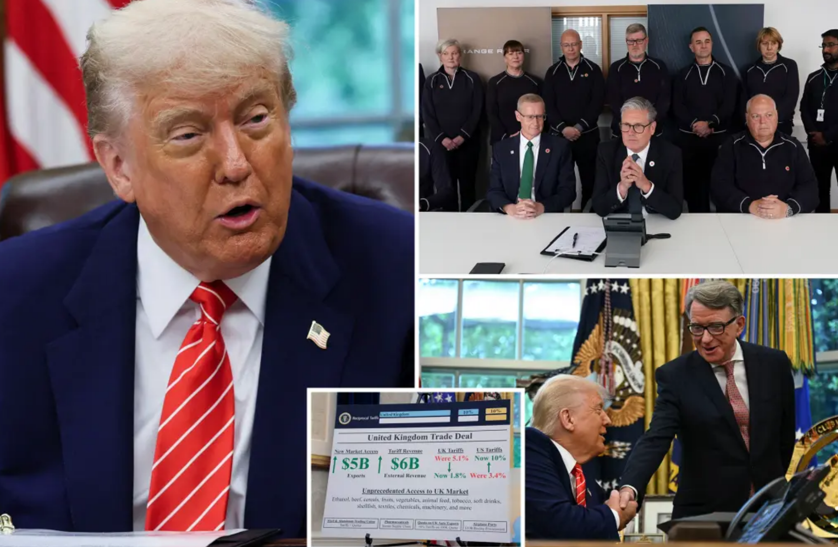 Премьер-министр Кир Стармер добился отмены 25%-ной пошлины на британскую сталь и 27,5%-ной на автомобили. Теперь для 100 тыс. авто в год установлен тариф в 10%, что, по расчётам правительства, позволит одному лишь Jaguar Land Rover экономить сотни миллионов долларов в год. США также согласились открыть рынок для 13 тыс. тонн британской говядины и снизить тариф на американский этанол до нуля.