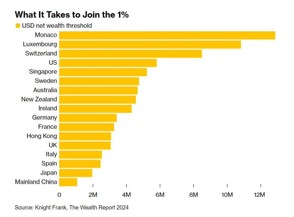 НЬЮ-ЙОРК (ИА Реалист). Сколько нужно иметь денег, чтобы присоединиться к 1% самых богатых людей по всему миру? Например, чтобы войти в число самых богатых американцев в 2024 году понадобится на 15% больше средств, чем год назад. Об этом сообщает агентство Bloomberg, ссылаясь на исследование международной консалтинговой компании Knight Frank.