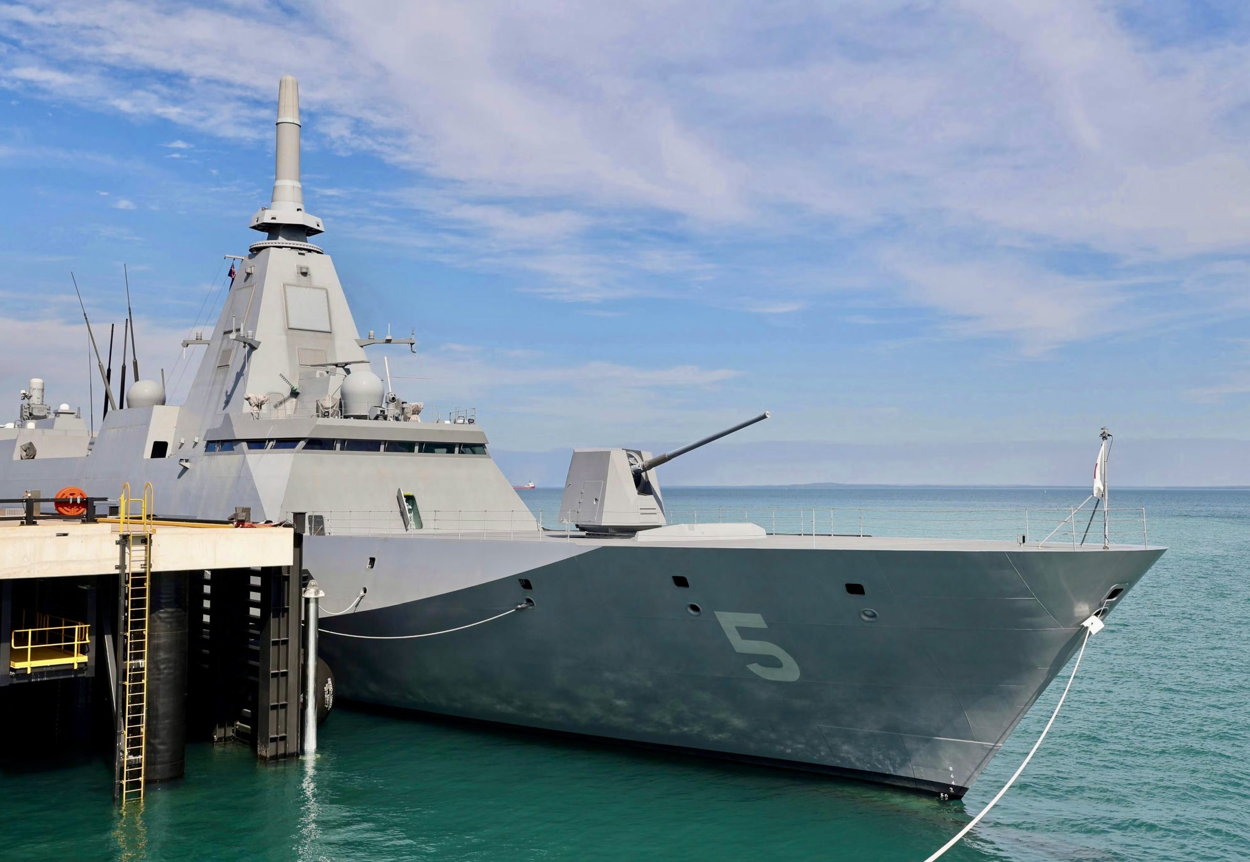 Японский военный корабль JS Yahagi (Яхаги), стелс-фрегат класса Mogami Морских сил самообороны Японии, замечен на стоянке в Дарвине, Австралия, в июне.