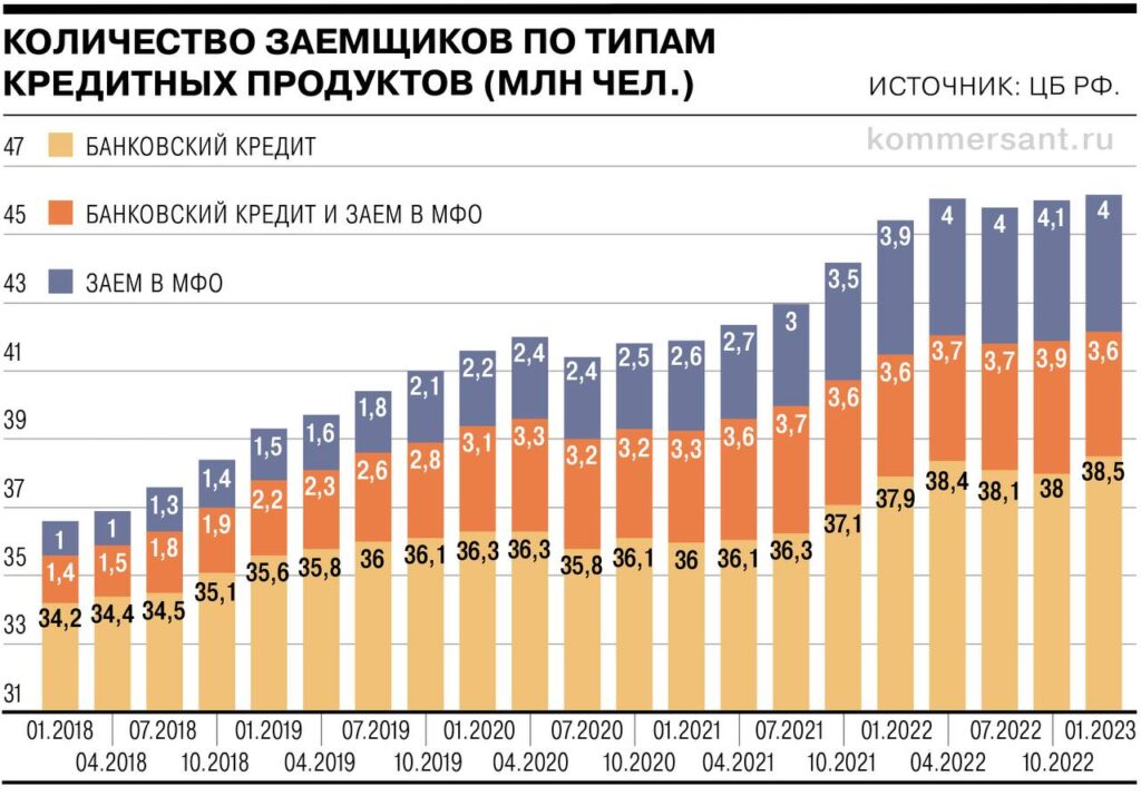 МОСКВА (ИА Реалист). По статистике бюро кредитных историй (БКИ), общее число заемщиков выросло с 34 млн в 2018 году до 46 млн человек в 2022 году. Это третья часть населения России и, как минимум, половина ее молодых и дееспособных граждан. Классификация по типу долгового рабства также впечатляет. Группа адептов микрофинансовых организаций растет быстрее, чем класс стандартных банковских холопов. Всего за четыре года численность заемщиков МФО умножилась на четыре.