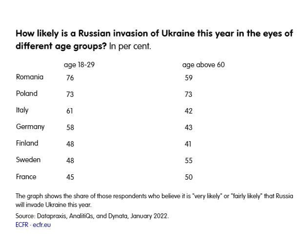 В Польше по историческим и географическим соображениям респонденты рассматривают перспективу российского вторжения как экзистенциальный кризис. Полякам во всех возрастных группах опасаются эскалации российско-украинской войны. В других странах наблюдается интересный разрыв между поколениями. К примеру, во Франции и Швеции люди старше 60 лет более склонны считать вторжение вероятным. В Румынии, Италии, Германии и Финляндии больше всего беспокоится молодое поколение – люди, родившиеся после окончания холодной войны.