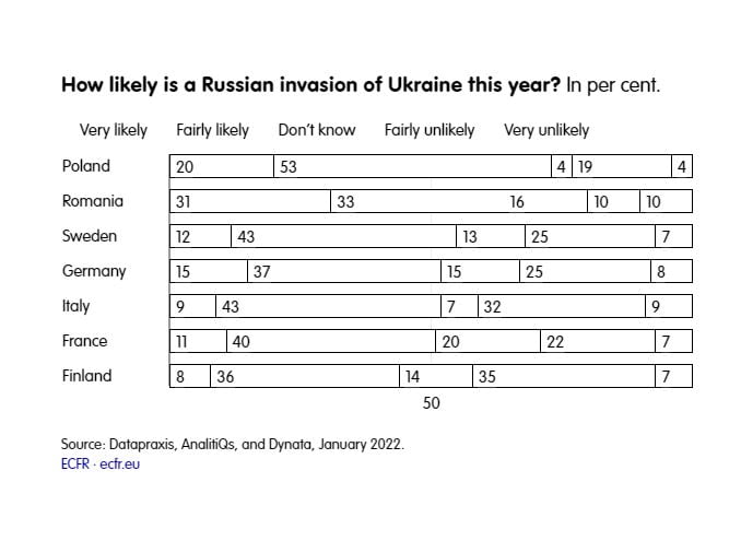 В отличие от 2014 года, европейцы рассматривают конфликт в Украине именно как европейский кризис. 73% опрошенных в Польше считают «вторжение России» вероятным. Схожей точки зрения придерживаются 64% респондентов в Румынии, 55% в Швеции, 52% в Германии, 51% во Франции и Италии, а также 44% в Финляндии.
