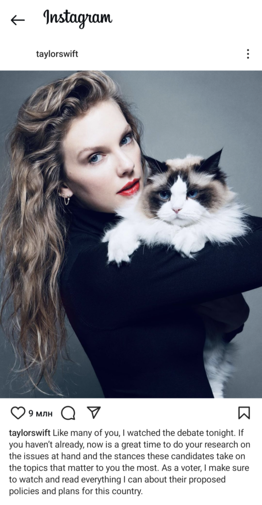 «Недавно я узнала, что на сайте Трампа был размещен ролик, созданный с помощью искусственного интеллекта, в котором я якобы поддерживаю президентскую кампанию Дональда Трампа. Это вызвало у меня опасения по поводу использования искусственного интеллекта и опасностей распространения дезинформации. Это привело меня к выводу, что я как избиратель должна быть предельно откровена в отношении своих реальных планов на эти выборы. Самый простой способ борьбы с дезинформацией — это говорить правду. Я отдам свой голос за Камалу Харрис и Тима Уолза на президентских выборах 2024 года. Я голосую за Харрис, потому что она борется за права и дела, которые, как я считаю, нуждаются в воине, способном их отстаивать. Я думаю, что она одаренный лидер, и я верю, что мы сможем добиться гораздо большего в этой стране, если будем руководствоваться спокойствием, а не хаосом», — написала Свифт, прикрепив к посту свою фотографию с кошкой на руках.