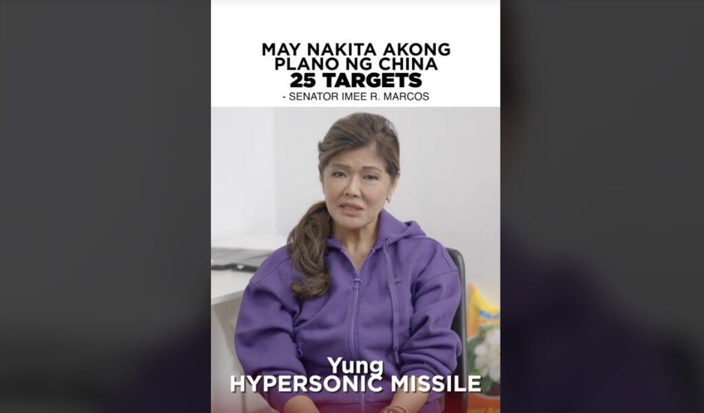 В частности, она сообщила, что КНР обозначил 25 целей вокруг Филиппинского архипелага, которые собирается атаковать гиперзвуковыми ракетами. И что северные острова Батанес, расположенные недалеко от Тайваня, станут первыми целями атаки. При этом сенатор не предоставила никаких доказательств, кроме аргумента, что «укрепление связей ее брата-президента с США заставили Китай рассматривать Филиппины как угрозу».