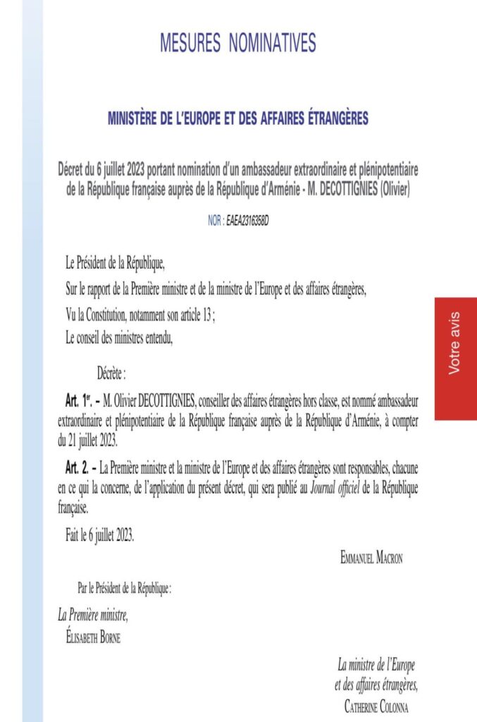 ПАРИЖ (ИА Реалист). Советник по иностранным делам Оливье Декоттиньи назначен послом Франции в Армении. Об этом сообщил почетный консул Армении во Франции Денис Джоркаефф.