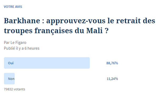 ПАРИЖ (ИА Реалист). Население Франции поддерживает решение властей вывести войска из Мали. Об этом свидетельствуют результаты опроса, проведенного на сайте еженедельника Le Figaro.