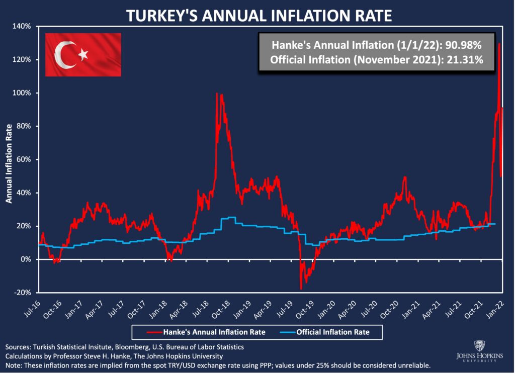 Турецкая лира потеряла 44% своей стоимости в 2021 году из-за отказа Эрдогана повышать ставки на фоне постоянного роста инфляции. Валютные потрясения ударили по благосостоянию турок, поскольку стоимость их зарплат упала, а цены на товары и энергию резко возросли. Глава государства отдает приоритет экспорту, последовательно утверждая (вопреки всем экономическим законам), что повышение ставок на самом деле усугубляет инфляцию, а не усмиряет ее.