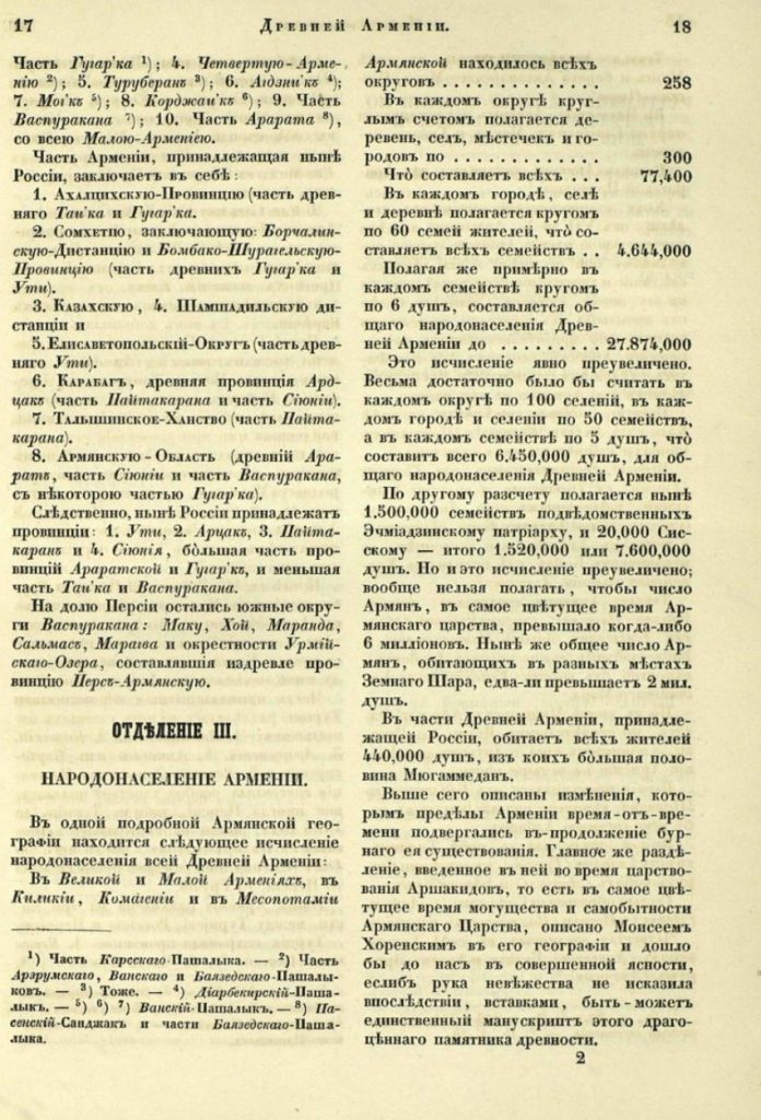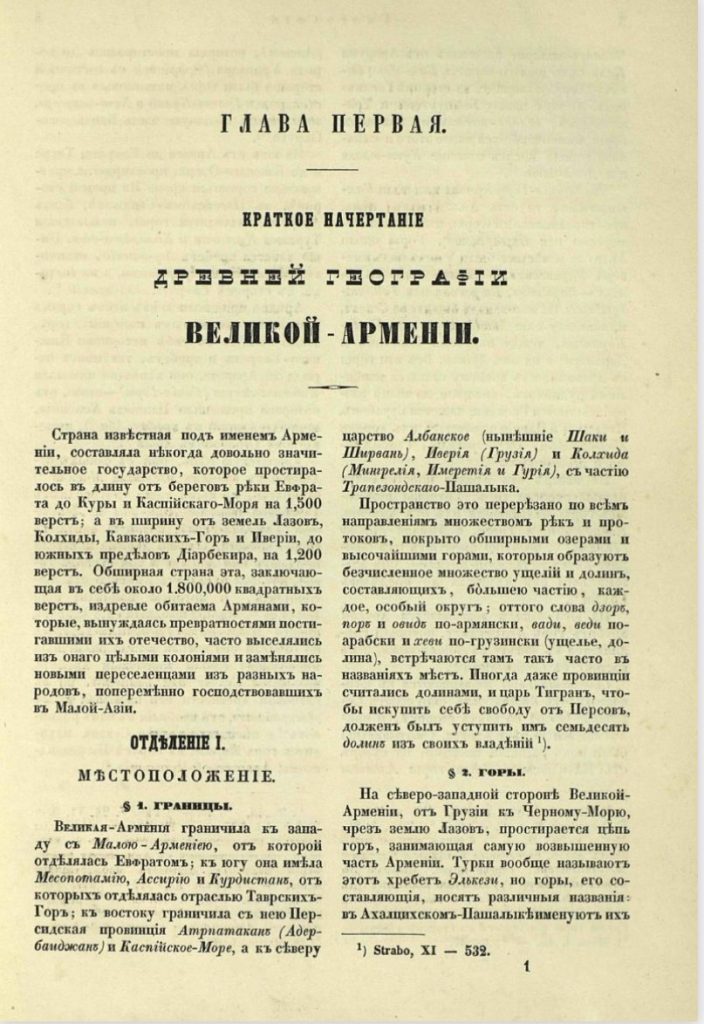 «Страна, известная под именем Армении, составляла некогда довольно значительное государство, которое простиралось в длину от берегов Евфрата до Куры и Каспийского моря на 1500 верст; а в ширину от земель Лазов, Колхиды, Кавказских гор и Иверии, до южных пределов Диарбекира, на 1200 верст.