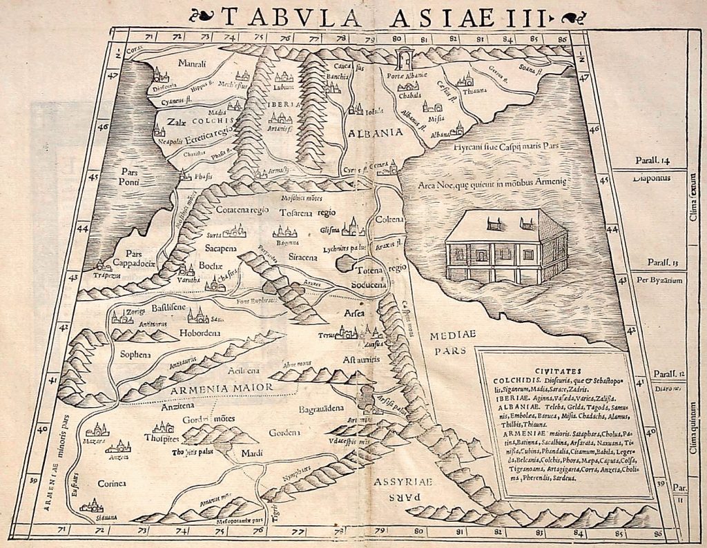 В частности, описание армянских границ принадлежит перу древнегреческого географа и математика Клавдия Птолемея (ок. 100 — 170 н.э.), который уточнял, что Армения граничит на севере с Колхидой, Иберией и Албанией (арм. Агванк) по линии, проходящей вдоль реки Кура, с запада — с Каппадокией вдоль Евфрата и по линии Каппадокийского Понта до Колхиды через Мосхийские горы, а с востока — с частью Каспийского моря от устья реки Кура.