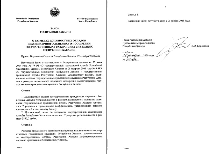 Автором законопроекта стал Коновалов, по инициативе которого в декабре прошлого года Верховный совет Хакасии принял закон «О размерах должностных окладов и ежемесячного денежного поощрения государственных гражданских служащих Республики Хакасия».