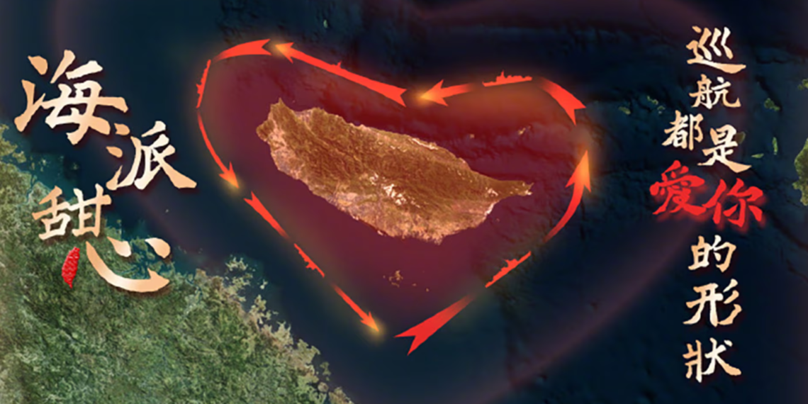 ТАЙБЭЙ (ИА Реалист). Береговая охрана Китая во время проходящих в Тайваньском проливе военных учений опубликовала в социальных сетях спутниковый снимок главного острова Тайваня, очерченный красными стрелками, складывающимися в фигуру, напоминающую сердце. Подписи к снимку, написанные традиционными китайскими иероглифами, гласили: «Привет, моя дорогая» и «Патруль — это воплощение любви к тебе».