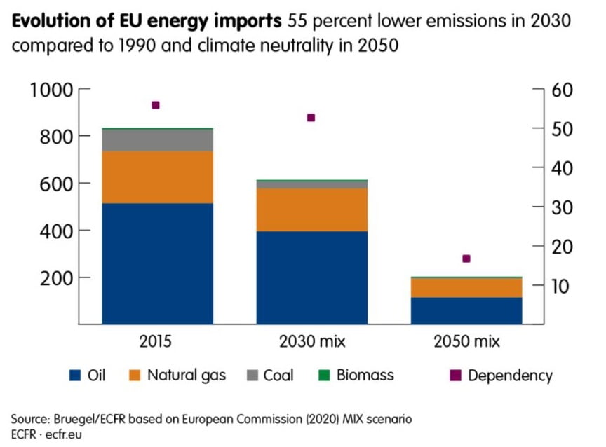 «В зависимости от конкретного сценария, импорт угля в ЕС упадет на 71-77% в период с 2015 по 2030 год, тогда как импорт нефти упадет на 23-25%, а импорт природного газа — на 13-19%. Ожидается, что после 2030 года импорт нефти и природного газа резко сократится: импорт нефти снизится на 78-79%, а импорт природного газа — на 58-67% по сравнению с 2015 годом», — пишут аналитики ECFR.
