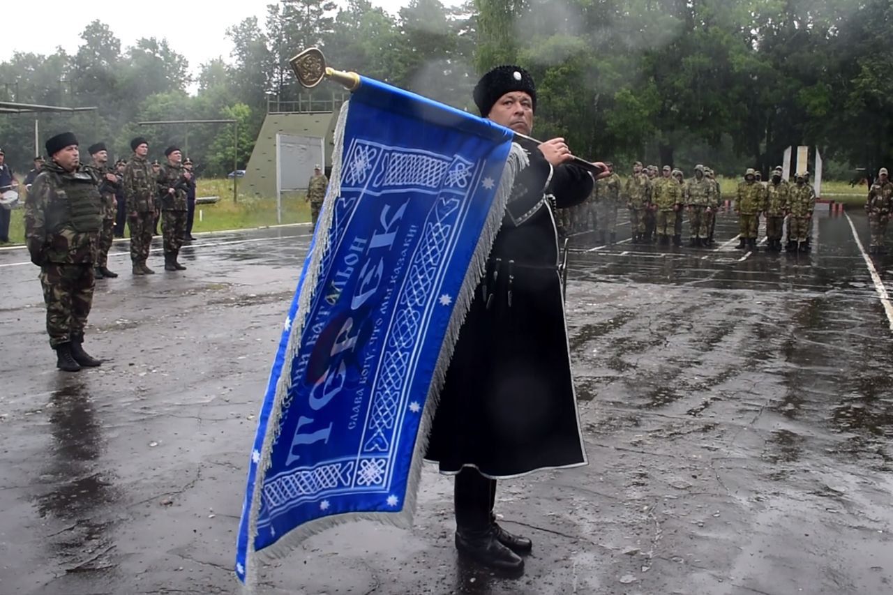 Боевое знамя командиру казачьего батальона «Терек» вручил атаман Терского казачьего войска, помощник полномочного представителя президента РФ в Северо-Кавказском федеральном округе, казачий полковник Виталий Кузнецов.