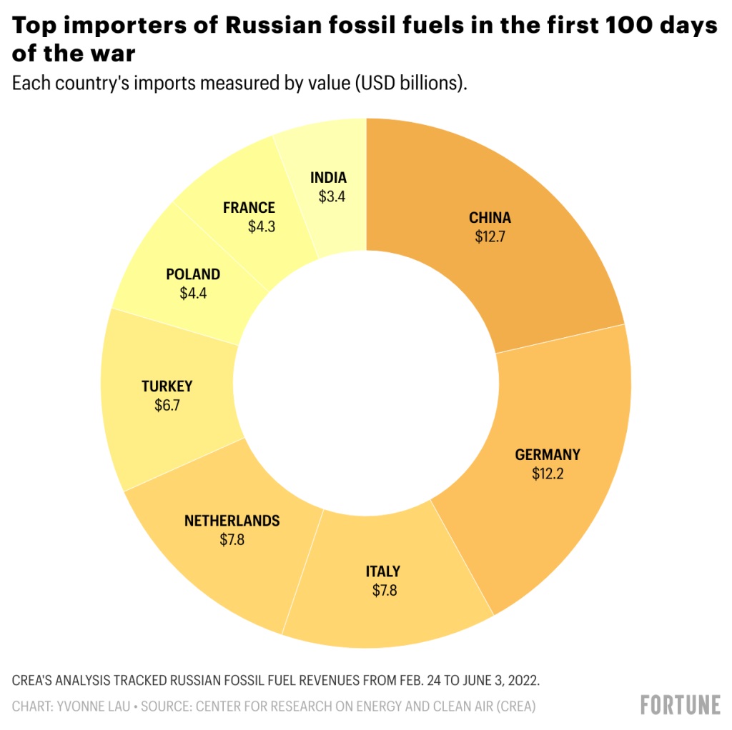 По данным швейцарского Центра исследований в области энергетики и чистого воздуха, за первые 100 дней войны Россия заработала рекордные $94 млрд на продаже ископаемого топлива несмотря на то, что продавала свою нефть с 30-процентной скидкой и экспортировала меньшие объемы. Только в мае Россия получила $20 млрд от продажи энергоносителей, что на 11% больше, чем в апреле.