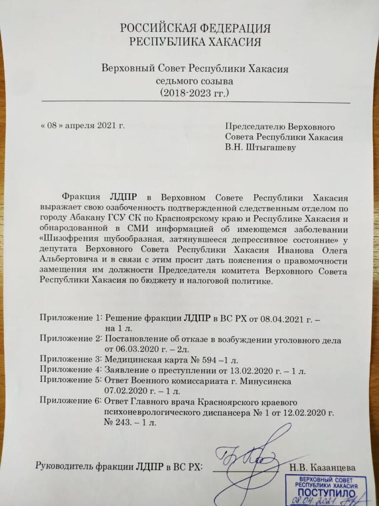 Фракция ЛДПР в Верховном совете Хакасии направила председателю регионального парламента Владимиру Штыгашеву официальный запрос о правомочности пребывания в должности руководителя бюджетного комитета заксобрания Олега Иванова, в свете наличия у него подтвержденного душевного заболевания. Официальный запрос от депутатов фракции ЛДПР на имя спикера Штыгашева был направлен в четверг, 8 апреля.