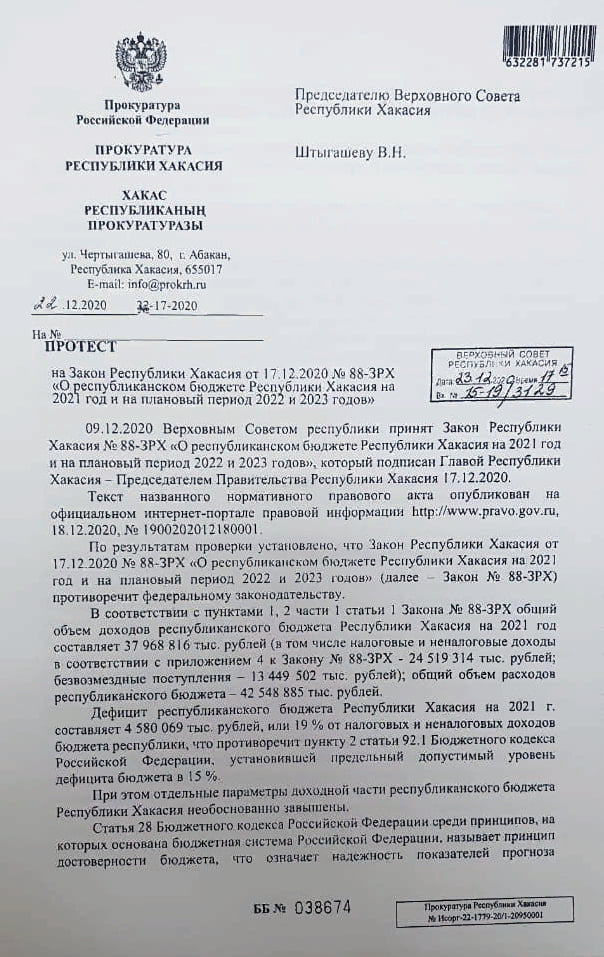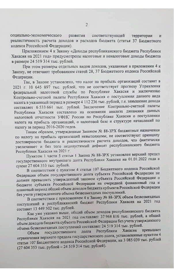 В принятом депутатами законе дефицит республиканского бюджета на 2021 год составляет более 4,5 млрд рублей, или 19% от налоговых и неналоговых доходов бюджета республики. При предельно допустимом уровне 15%. Кроме того, прокурор указывает на виртуальные доходы, прописанные в законе о бюджете: «отдельные параметры доходной части республиканского бюджета Республики Хакасия необоснованно завышены». Принятым законом установлено, что в следующем году налог на прибыль организаций составит свыше 10,6 млрд рублей. В то же время, прогноз Управления федеральной налоговой службы по Республике Хакасия и экспертное заключение Контрольно-счетной палаты говорят, что эта сумма завышена более чем на 6,5 млрд рублей. Таким образом, по мнению прокуратуры, «бюджетные назначения по налогу на прибыль организаций невыполнимы». Нарушен Бюджетный кодекс и в части соблюдения соотношения объема госдолга к общему объему доходов бюджета субъекта. По факту документ принят с превышением на 3 млрд рублей.