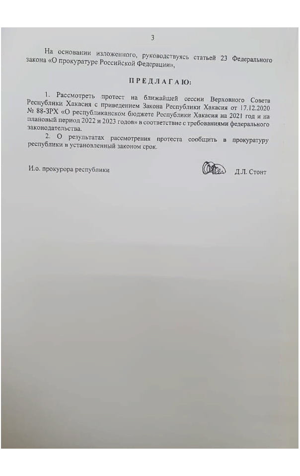 Несмотря на очевидные нарушения норм федерального закона, на январской сессии Верховный Совет Хакасии отклонил протест республиканской прокуратуры, как итог обращение в Верховный Суд.
