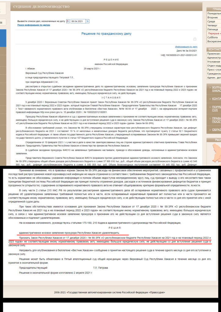29 марта Верховный Суд Хакасии удовлетворил административный иск прокуратуры и признал недействующим региональный закон о республиканском бюджете. Второго апреля решение опубликована на официальном сайте суда, который согласился с мнением прокуратуры о том, что закон принят с грубейшими нарушениями федерального законодательства. Надзорники установили — нарушены сразу несколько норм Бюджетного кодекса России.