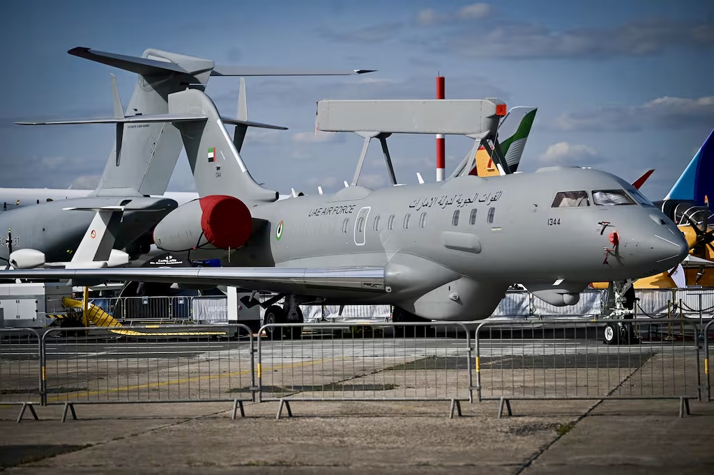Самолёт Saab GlobalEye, эксплуатируемый Военно-воздушными силами Объединённых Арабских Эмиратов, представлен на авиасалоне в Париже 16 июня 2025 года. Фото: Bloomberg / Getty