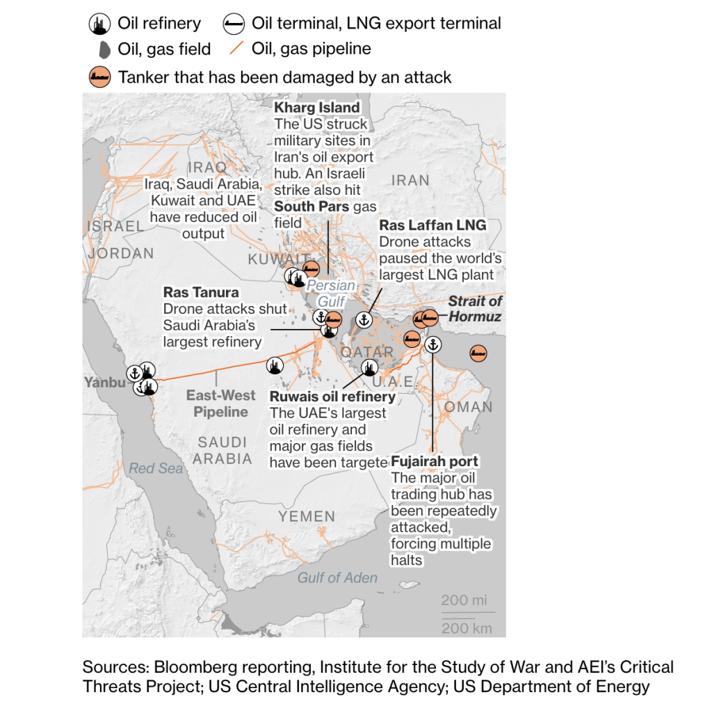 Долгосрочно кризис может изменить энергетический ландшафт Ближнего Востока. Оман предлагает свой удалённый порт Дукм в качестве альтернативного регионального хаба. Объединённые Арабские Эмираты используют трубопровод мощностью 1,5 млн баррелей в сутки до порта Фуджейра в Оманском заливе, но сам порт неоднократно подвергался атакам в последние недели. Ирак договорился с курдской автономией о совместном использовании трубопровода в турецкий средиземноморский порт, но эти объёмы несопоставимы с 3 млн баррелей, которые страна ежедневно отправляла через Персидский залив.