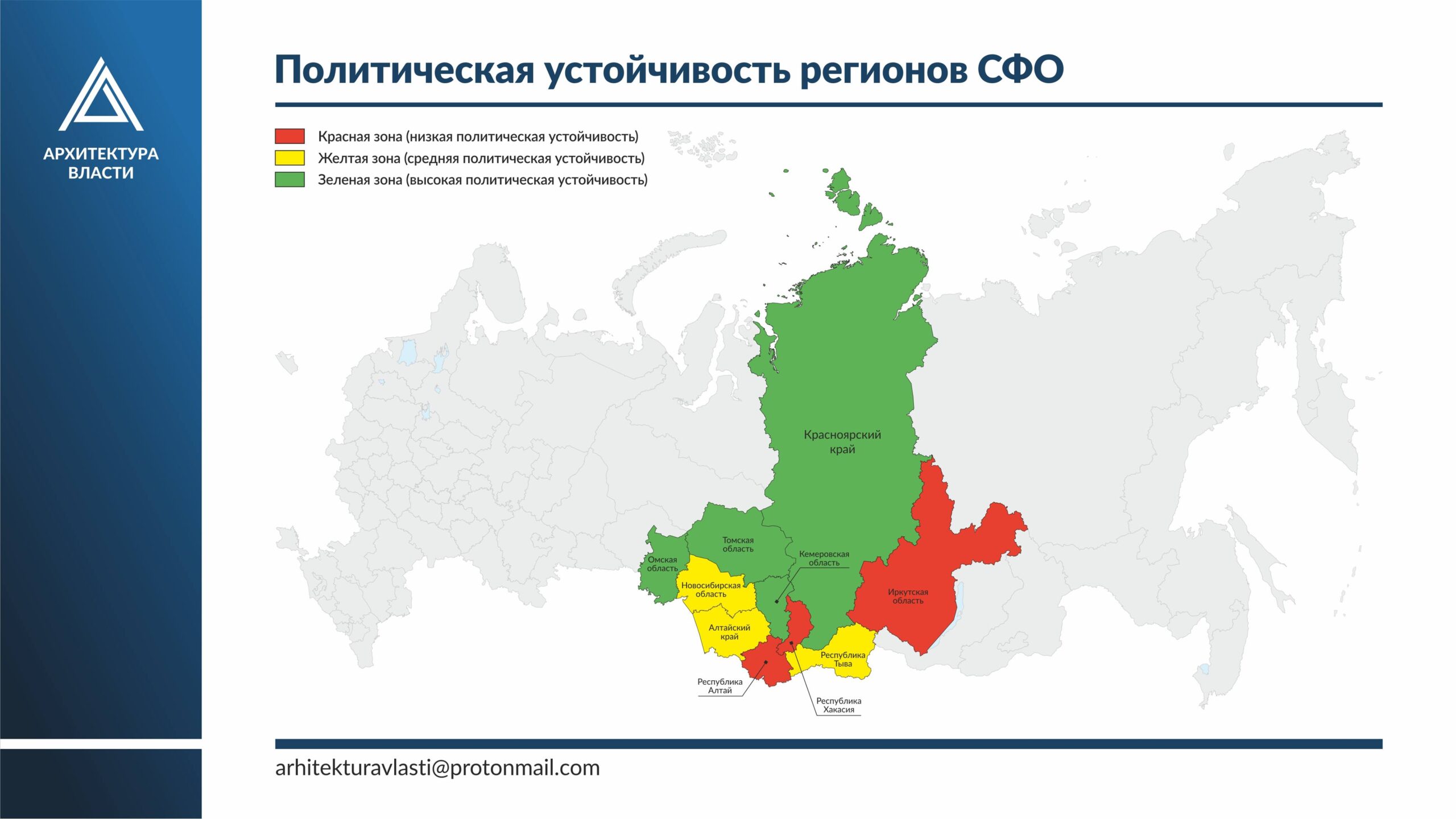 Условно сибирские регионы разбиты на три зоны. Тревожные регионы – в красной, стабильные – в жёлтой, авангард – зелёные.