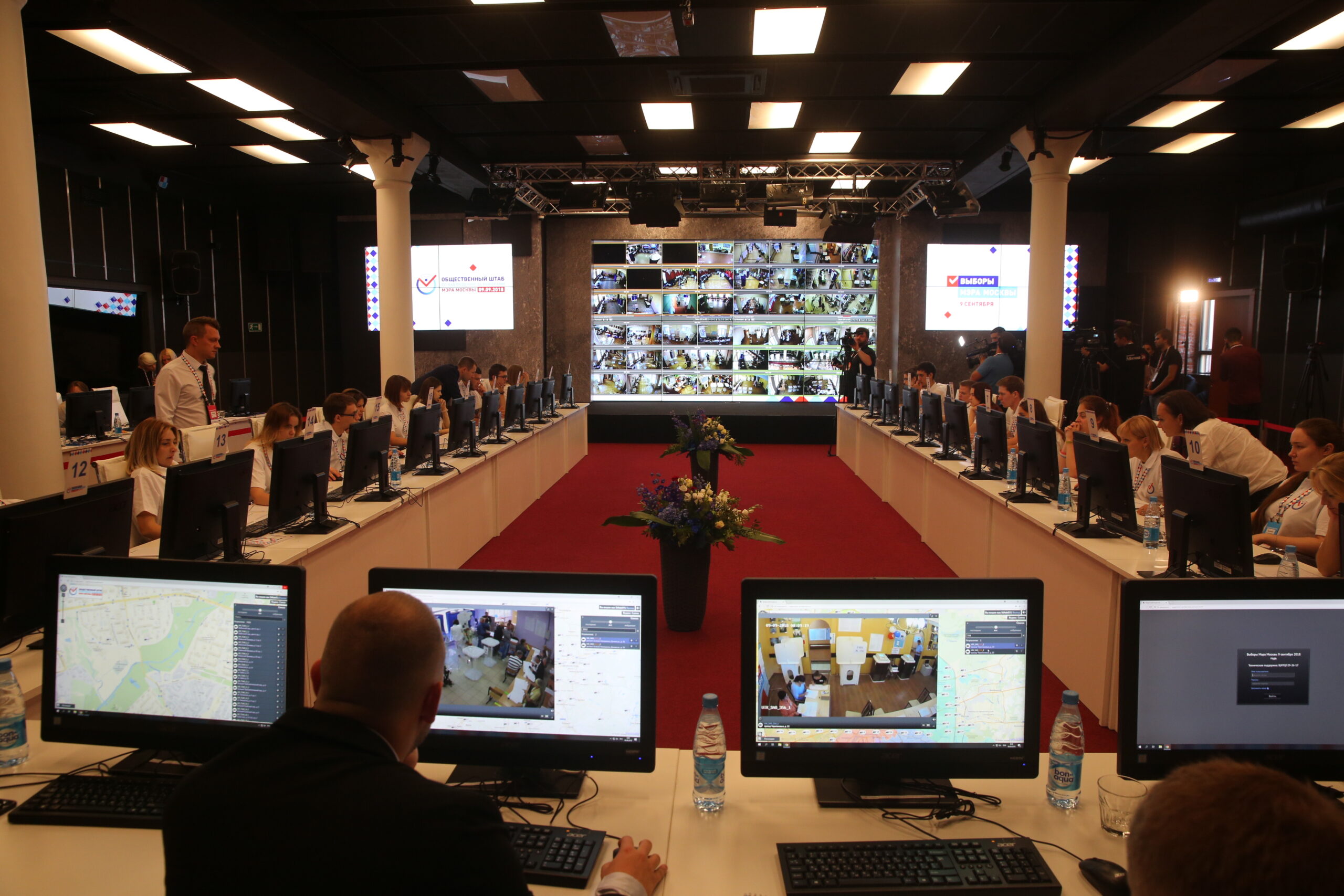 Как и в предыдущие годы, на базе Общественного штаба работал Видеоцентр, в котором в день голосования операторы – волонтеры из числа московских студентов – отслеживали по камерам все, что происходило на участках, выявляли нарушения и проблемные ситуации. На протяжении дня работали по очереди две группы видеонаблюдателей, которые менялись каждые 5 часов. В состав группы входило 28 человек, из них 22 одновременно следили по мониторам за участками, 2 – это старшие группы, а еще 4 волонтера находились в резерве.