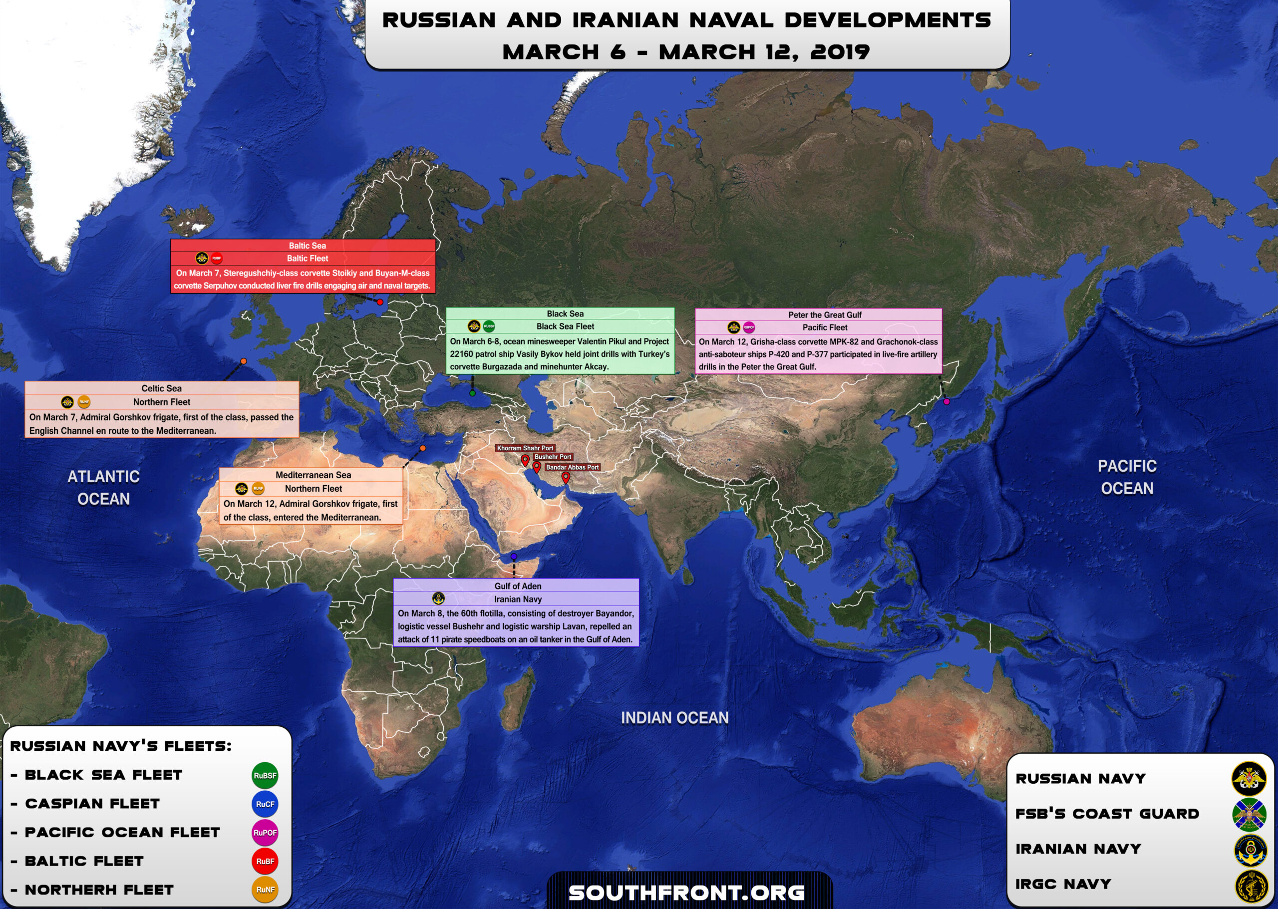 12 марта корабли Тихоокеанского флота приняли участие в артиллерийских учениях в заливе Петра Великого в Японском море. Малый противолодочный корабль МПК-82 и противодиверсионные катера П-420 и П-377 отработали элементы противовоздушной обороны корабля на переходе морем. Огнем артиллерии они отразили сбрасываемые парашютные мишени.