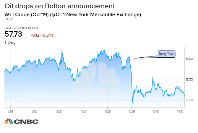 Отставка советника президента США по национальной безопасности Джона Болтона обвалила мировые цены на нефть, сообщает телеканал CNBC.