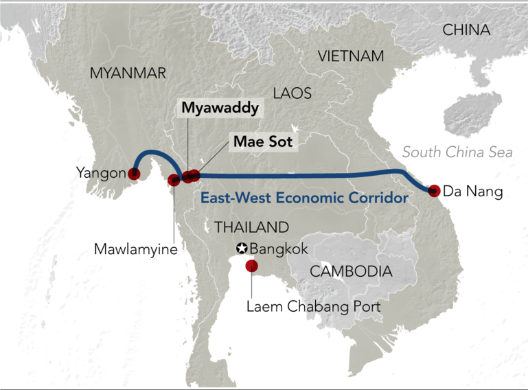 Речь идет об экономическом коридоре Восток-Запад, который проходит через Вьетнам, Лаос, Таиланд и Мьянму. Проект обеспечивает альтернативные цепочки торговых поставок на случай блокировки Малаккского пролива усилиями внешних держав, в частности, ВМФ США.