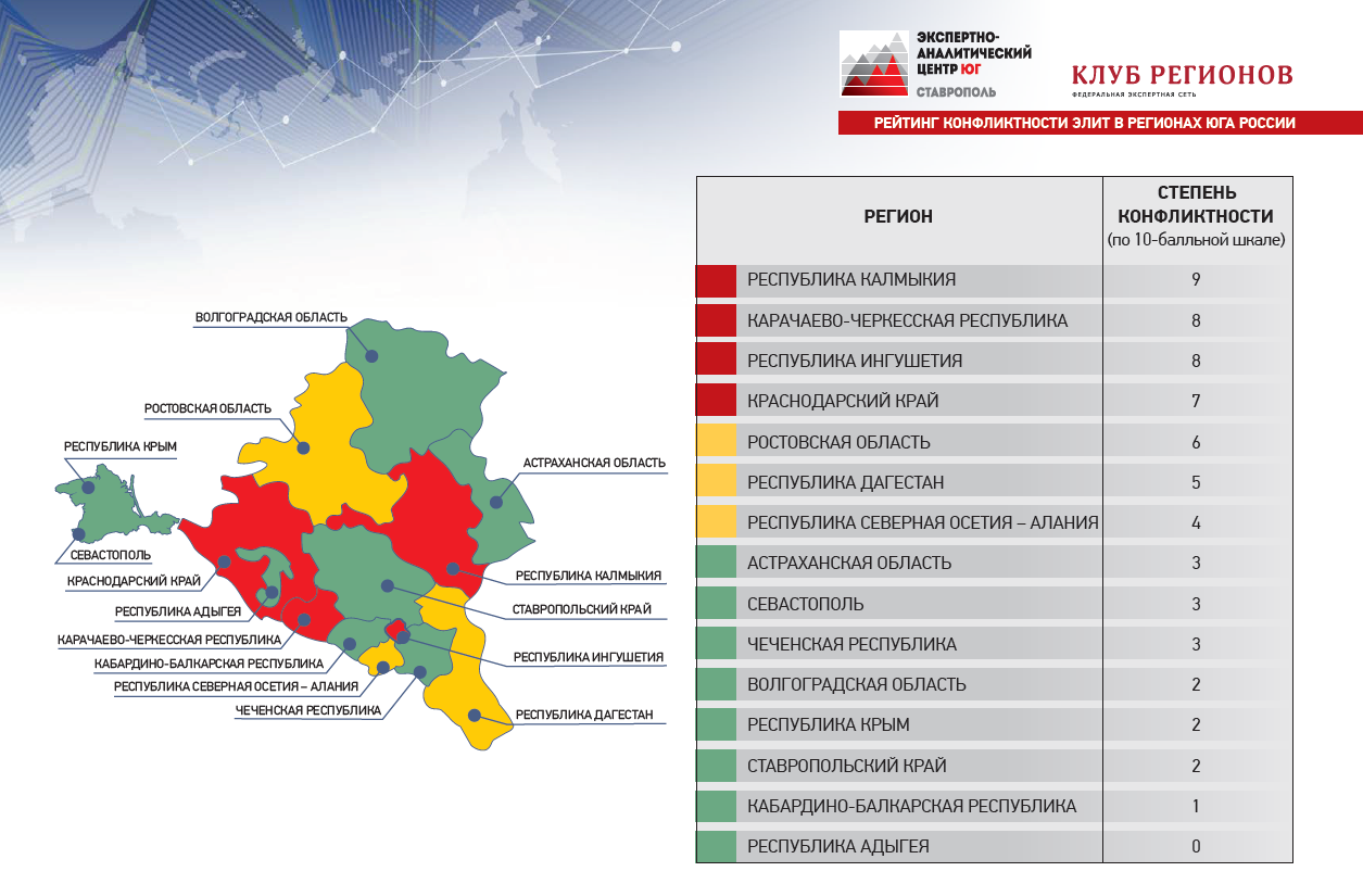 Экспертно-аналитический центр «Юг» и федеральная экспертная сеть «Клуб Регионов» опубликовали «Рейтинг конфликтности элит в регионах Юга России». В исследовании проанализированы конфликты элит в регионах ЮФО и СКФО, определены основные акторы, внешние проявления и скрытые мотивы конфликтов. Кроме того, изучены стратегии и тактики противоборствующих элитных групп, а также влияние конфликтов на текущую политическую обстановку. Дана оценка способности глав регионов Юга удерживать ситуацию под контролем.
