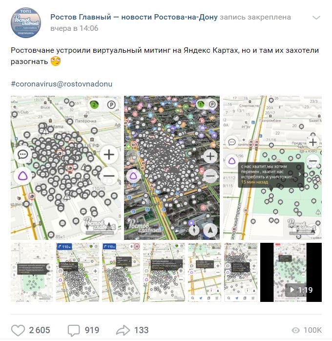 «Цифровые митинги» в Ростове-на-Дону и Екатеринбурге – обратная сторона ярко блестящей медали под названием «цифровизация» борьбы с коронавирусом, считает политолог Максим Жаров. 20 апреля Ростова-на-Дону организовали виртуальный митинг в знак протеста против режима самоизоляции и действий местных властей. В приложении «Яндекс.Навигатор» у здания правительства области появились десятки комментариев с требованием ввести чрезвычайное положение или выплатить пособия. Аналогичные акции виртуального протеста прошли в Красноярске и Нижнем Новгороде.