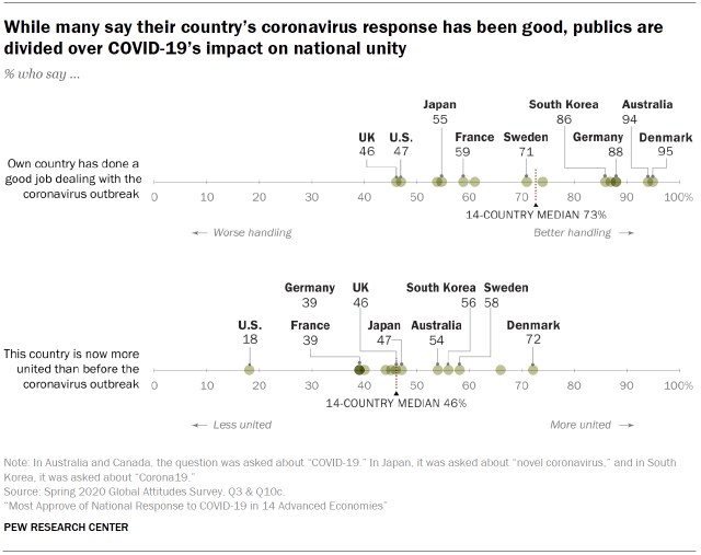 Так называемая пандемия способствовала расколу чувств национального единства во многих обществах: в среднем 46% опрошенных ощущают больше единства сейчас, чем до вспышки коронавируса, а 48% считают, что разногласия усилились. В США этот показатель достиг рекордных 77%. Оставшиеся 18% американцев считают, что их страна стала более сплоченной, чем до пандемии.