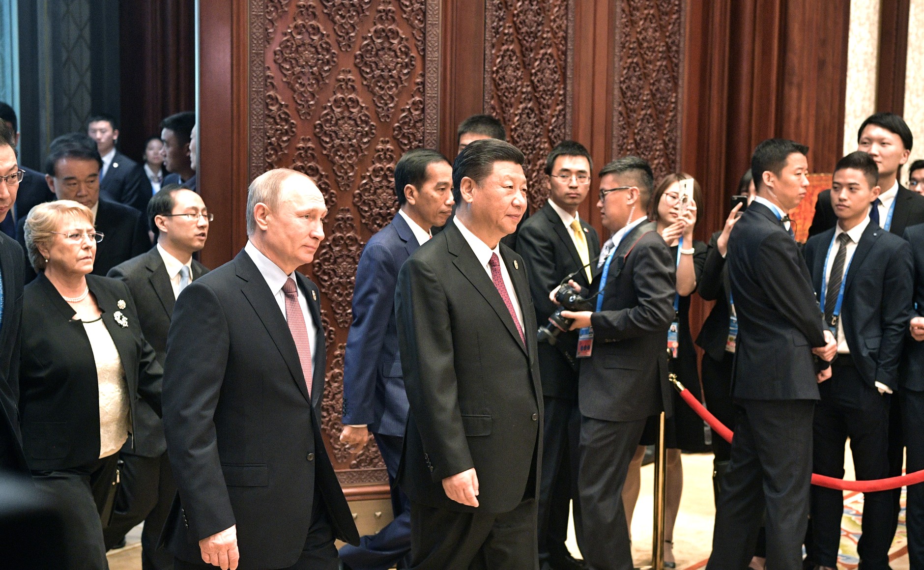 Владимир Путин и Си Цзиньпин перед началом заседания круглого стола лидеров форума "Один пояс, один путь". Иллюстрация: kremlin.ru