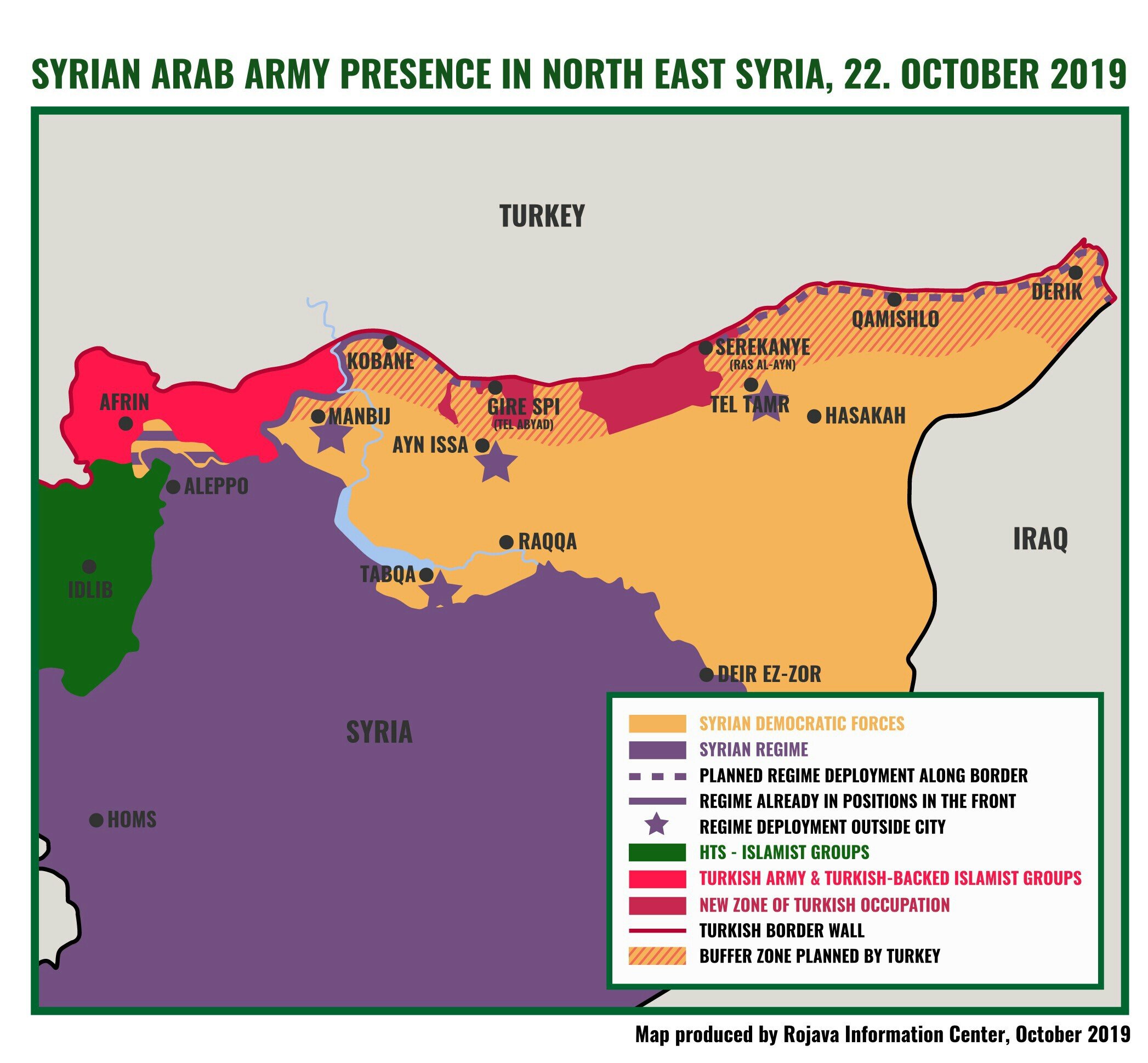 Чтобы избежать дальнейшего кровопролития, курдские ополченцы отошли вглубь сирийской территории до 30 км и согласились с вводом в ряд приграничных районов на северо-востоке страны правительственных войск, а также совместных российско-турецких военных патрулей на бронемашинах. Что касается органов самоуправления и всей структуры «Рожавы», то они остались неприкосновенными.