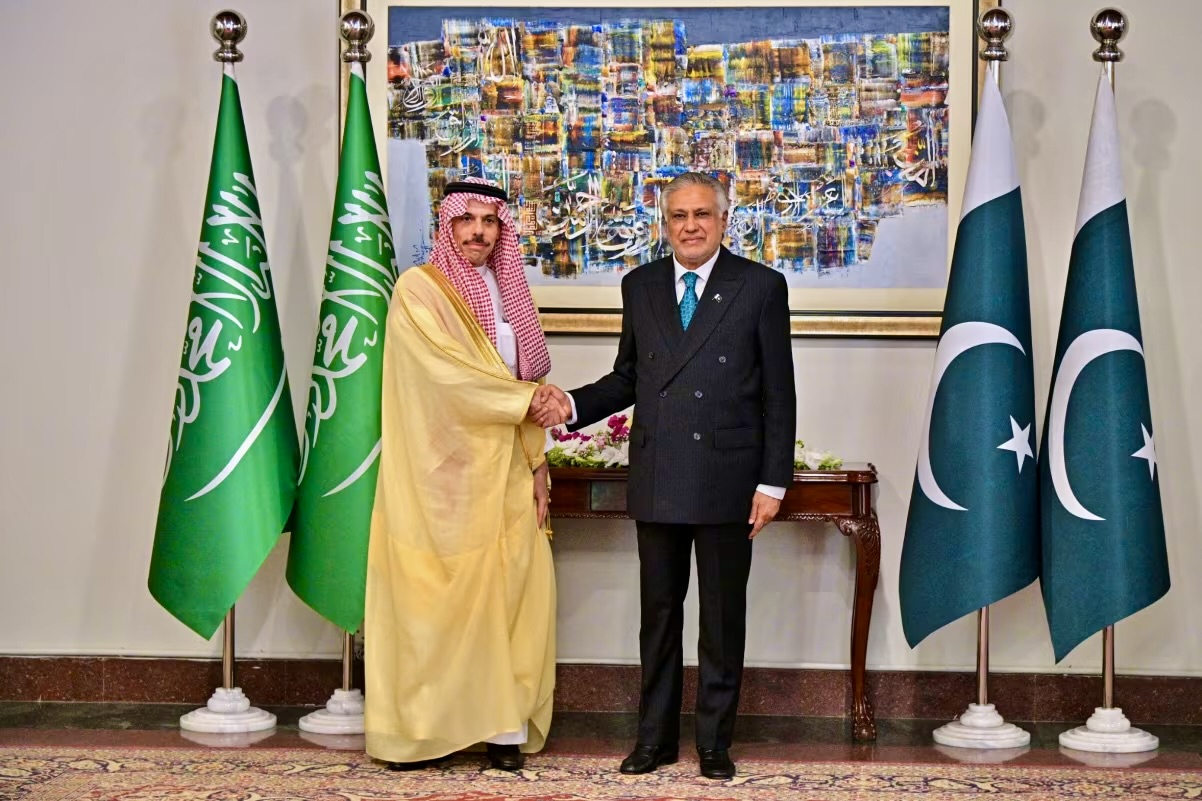 Министр иностранных дел Саудовской Аравии принц Фейсал бен Фархан Аль Сауд (слева) пожимает руку своему пакистанскому коллеге Исхаку Дару перед встречей в Исламабаде, Пакистан, 29 марта 2026 года. Фото: МИД Пакистана / AP