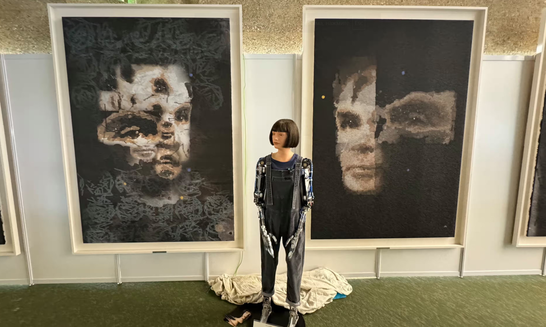 Робот Ai-Da на фоне портретов Тьюринга. Работа "AI God. Портрет Алана Тьюринга", которая была продана, висит справа. Фото: Sotheby's/EPA