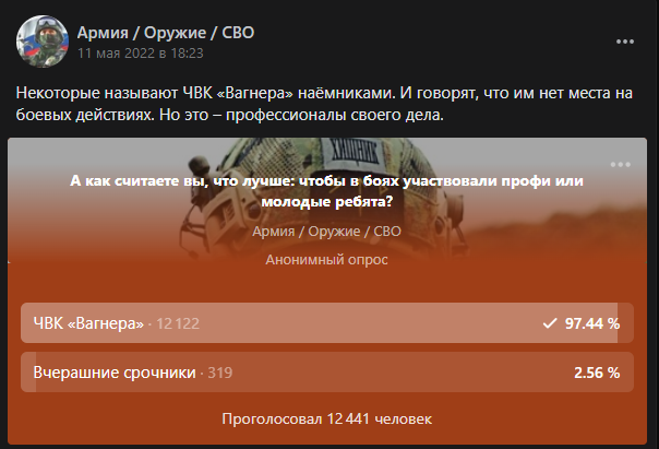 В ходе опроса о военных операциях, в котором участвовало более 12 тыс. человек, подавляющее большинство пользователей — более 97% — высказались в пользу участия в них «ЧВК Вагнера».