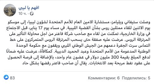 Согласно сообщениям арабских СМИ, в ходе переговоров Уильямс хотела добиться, чтобы Пригожин и «ЧВК Вагнера», владение которой ему приписывают, перестали поддерживать Ливийскую национальную армию фельдмаршала Халифы Хафтара и начали сотрудничать с Правительством национального единства и его главой Абд аль-Хамидом Дабибой.
