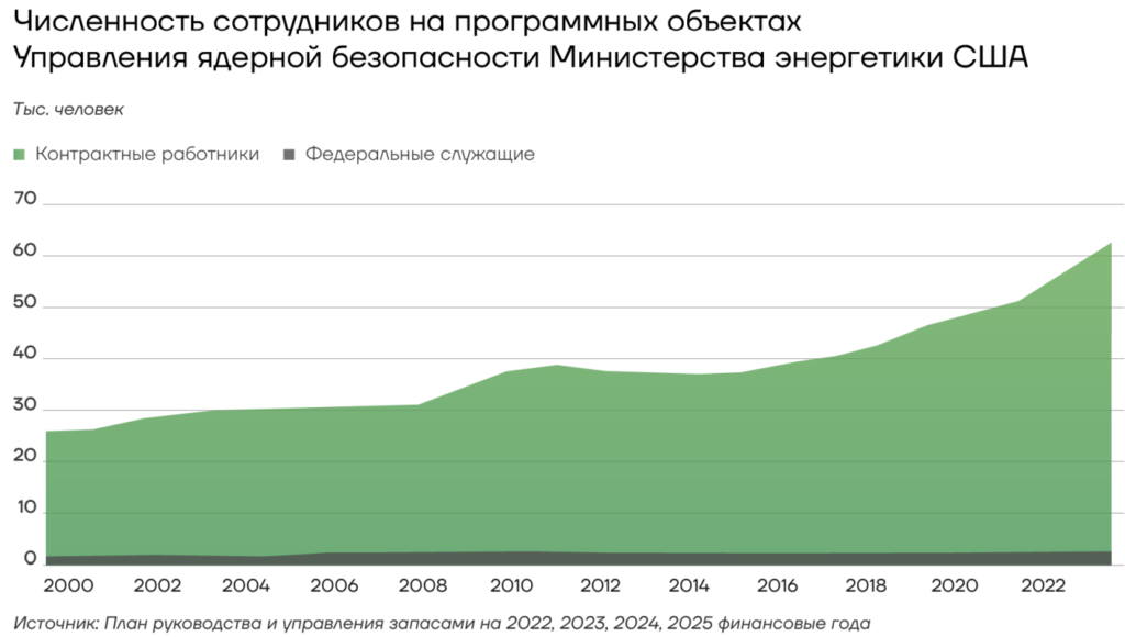Так, на заводе Pantex Plant численность сотрудников возросла с 3 266 в конце 2018 г. до 4 095 в конце 2022 г. Штат был расширен на 26% всего за четыре года, а средний возраст персонала за это время уменьшился на три года, достигнув 44 лет. Значительней прирост сотрудников зафиксирован и в Национальной лаборатории Лос-Аламос и предприятии в Саванна-Ривер, где будут собирать плутониевые сердечники. Численность сотрудников возросла относительно уровня 2018 г. на 58 и 69% соответственно, достигнув отметок в 10 275 человек и 902 сотрудника. Средний возраст снизился с 49 и 47 до 44 лет в обоих случаях.