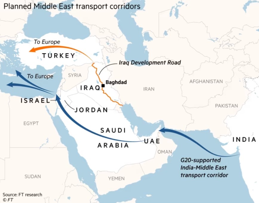 9 сентября президент США Джозеф Байден вместе с лидерами Индии, Саудовской Аравии и ОАЭ объявили о Меморандуме о взаимопонимании (МоВ), который предполагает развитие нового интермодального торгового маршрута Индия – Ближний Восток – Европа. США надеются, что расширение связей будет способствовать нормализации отношений между Ближним Востоком и Израилем, одновременно ускоряя торговлю между Индией и Европой на 40%.