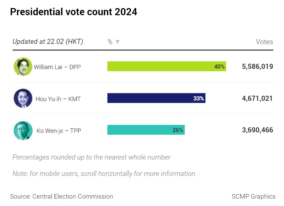 Представитель «Гоминьдана» Хоу Юй официально признал свое поражение в 8 часов вечера и поздравил Лая с победой: «Я уважаю окончательный выбор тайваньского народа»