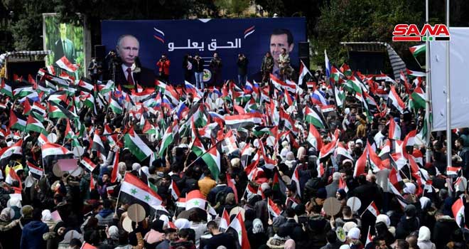ДАМАСК (ИА Реалист). В сирийских городах проходят митинги, на которых вместе реют национальные флаги России и Сирии, плакаты с портретами президентов двух стран Владимира Путина и Башара Асада и транспаранты с призывами «Россия, вперед!», «Россия для Сирии родная».