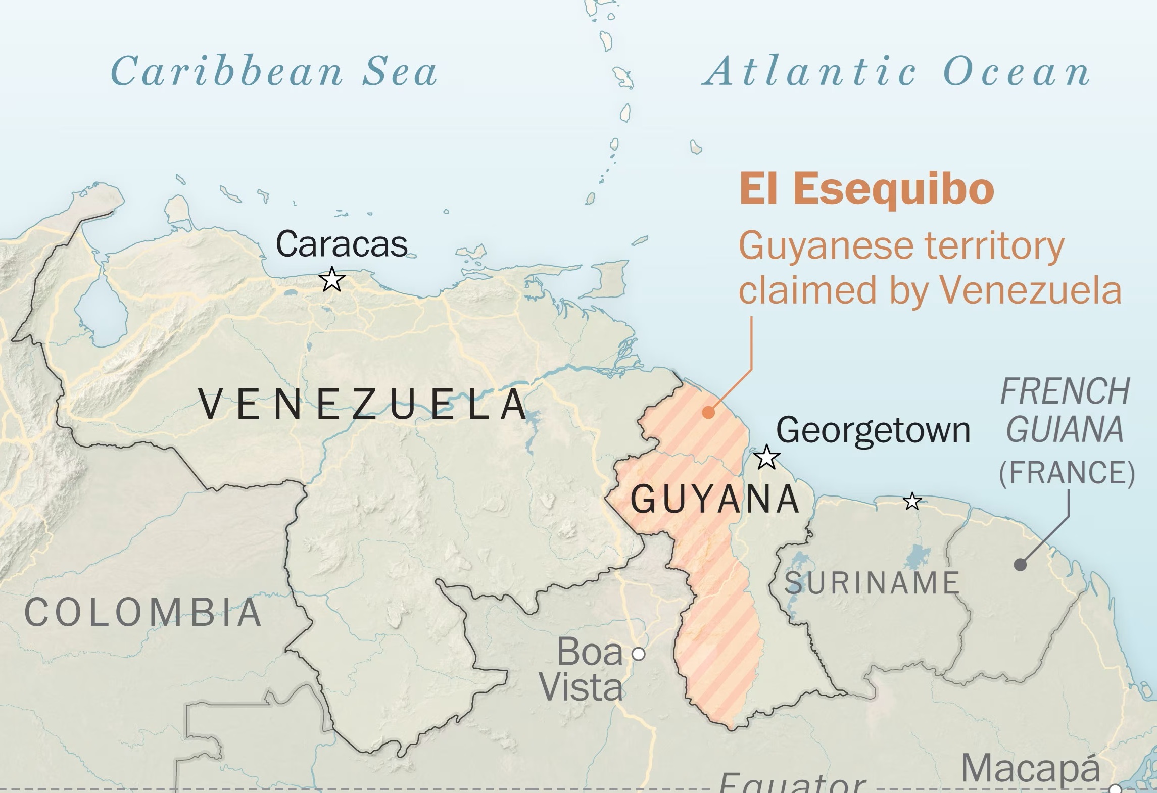 Спор возник в результате международного арбитража 1899 года, который определил границы тогдашней Британской Гвианы. В 1962 году, за четыре года до того, как Гайана получила независимость от Великобритании, Каракас объявил, что не считает вопрос решенным. Венесуэльцы утверждают, что река Эссекибо является ее естественной границей, поскольку территория находилась под властью Испании.